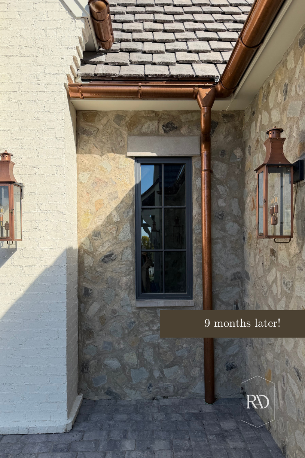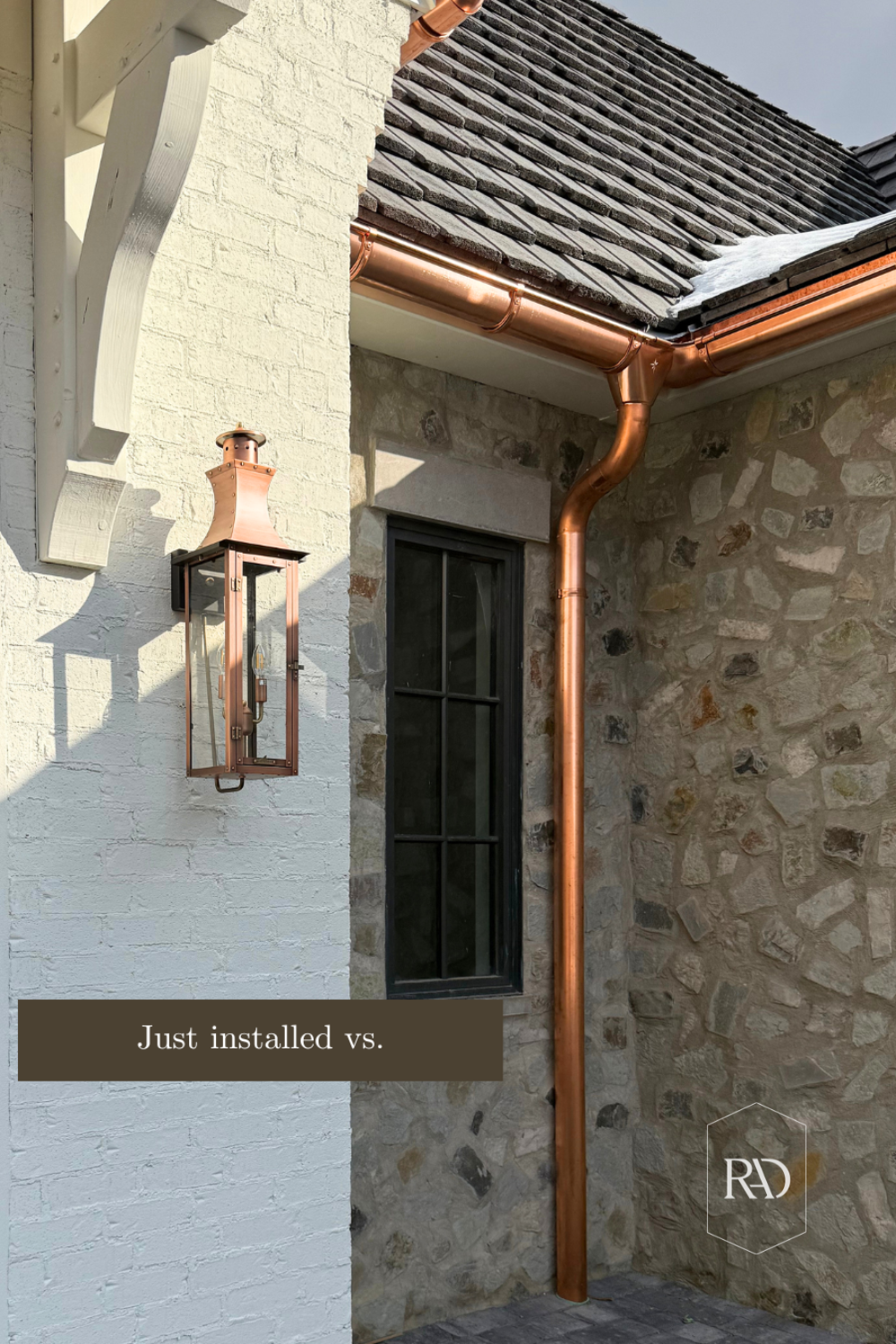 We installed our copper features in late January/early February. At first, they were bright. Really bright. Between the gutters, garage awning, outdoor lanterns, and front entry, I started to worry that I had done too much. If you’ve ever installed new copper, you know exactly what I mean. That almost penny-like shine can be a little intimidating.