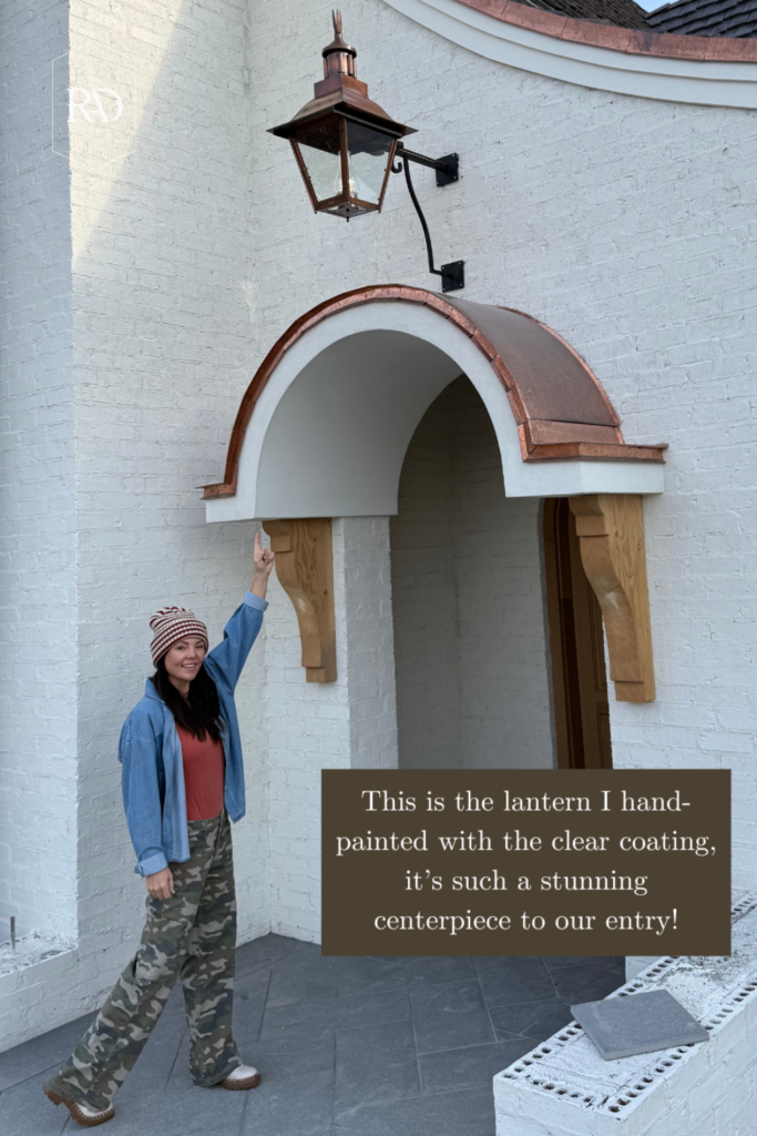 And then, I hand painted the copper lantern just above our entryway. it came aged but I didn’t want it to change any more. It works as a clear sealant that enhances the copper’s natural glow while preventing further oxidation and patina. We applied two coats to fully lock in the color. This product should keep our copper looking this good for 5–7 years before needing to be reapplied.